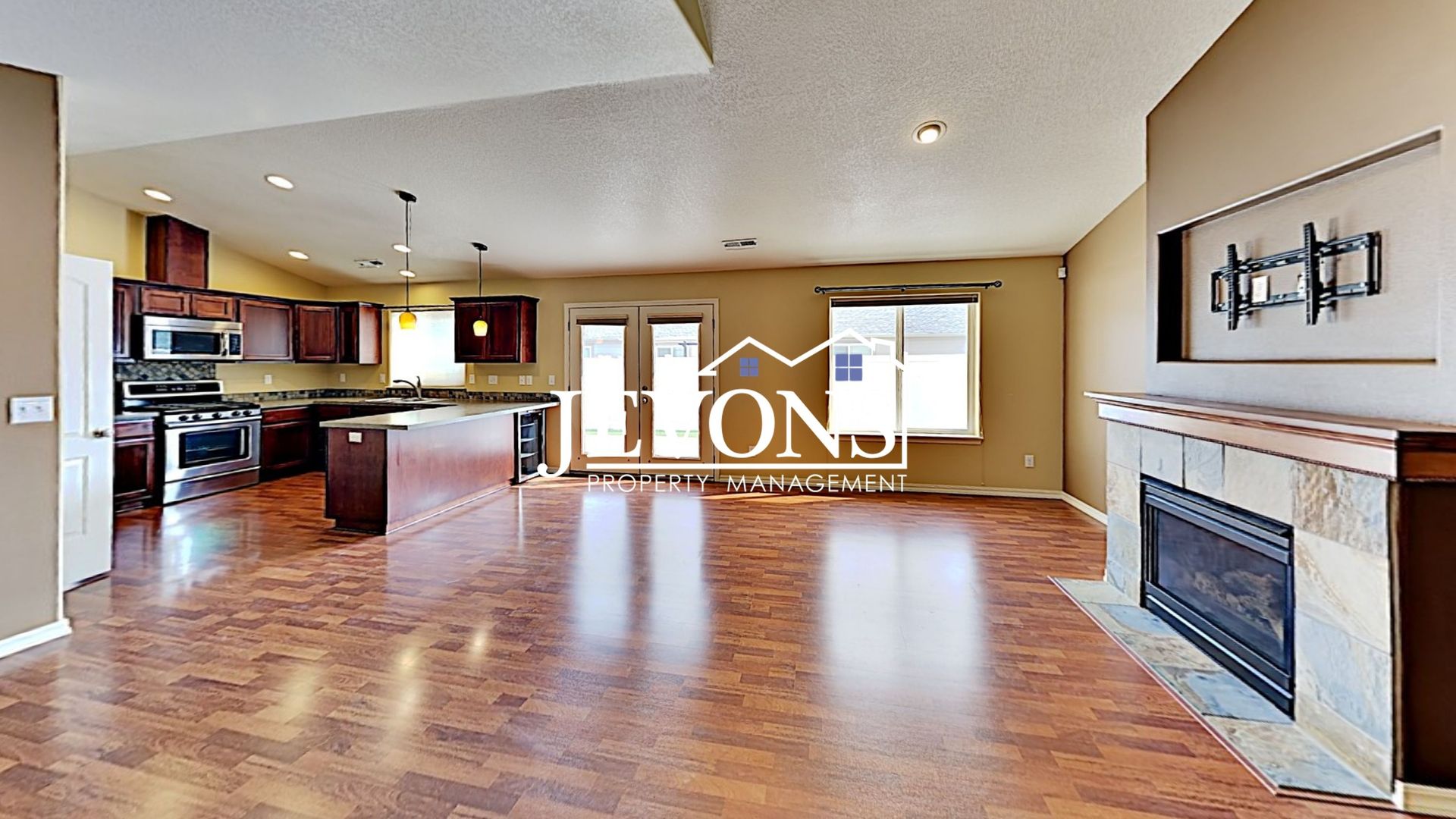 - Living Room: Gas fireplace, sliding door and a wine fridge